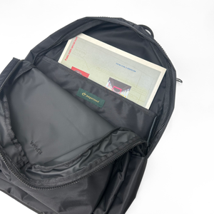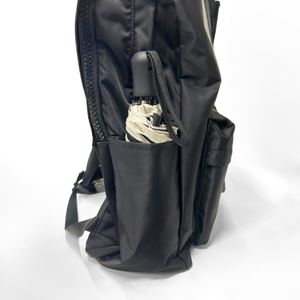 さりげないロゴ刺繍もポイント。見た目はシンプルですが、サイドポケットなどこだわりが詰まった使いやすいリュックサックです。