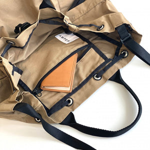 コットンとナイロンのミックス素材なので、ソフトな手触りが特徴です。 フロント部分のロゴ刺繍がポイント。 自転車に乗るときにも嬉しい2way仕様で、調節バックルがついており斜めがけも可能です。 軽くて大容量なので、ヨガやジムなどのお稽古事のバッグやママバッグとしてもオススメ。
